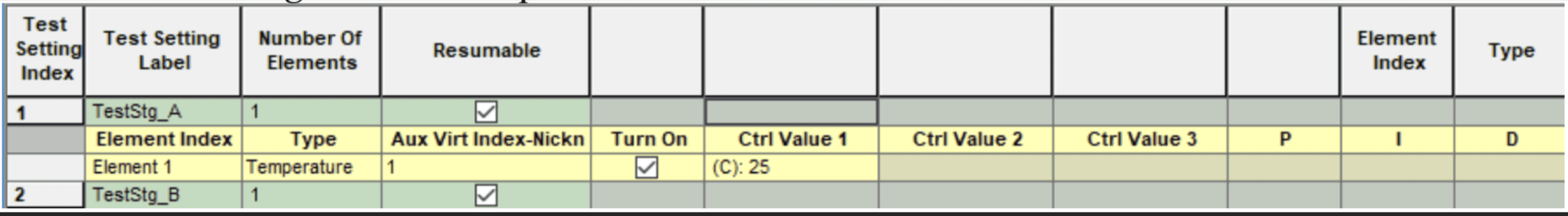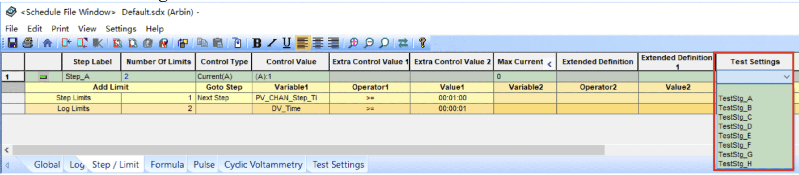 위의 예시에서 "TestStg_A"를 선택하면 단계 A는 다음을 설정합니다. 온도 챔버 25°C로 설정합니다. 기능에 대한 자세한 내용은 Arbin MITS 매뉴얼에서 확인할 수 있습니다.