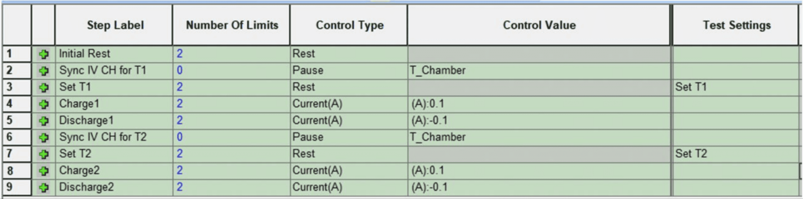 - 충전/방전 사이클 후 모든 IV 채널이 6단계에 연속적으로 도달하고 여기서 다시 동기화된 후 7단계로 계속 진행하여 챔버 온도를 T2로 설정합니다.